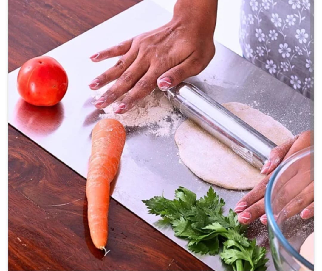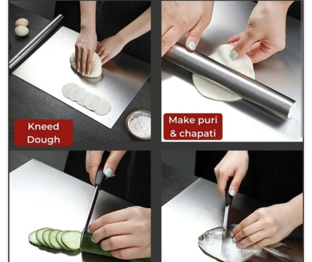 - The contemporary design of the stainless steel board adds a modern touch to your kitchen. Its sleek, clean lines complement any kitchen decor, making it not only a functional tool but also an aesthetic piece in your cooking space.